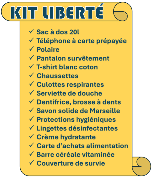 La composition de ce kit a été élaborée et testée avec deux acteurs du soutien aux femmes victimes de violence : le Parcours Diane, dispositif d’aide et de soins à l’hôpital de Nanterre, et L’Escale, centre d’accueil et d’hébergement à Gennevilliers, dont la directrice interviendra lors de la Soirée solidaire le 20 novembre prochain.